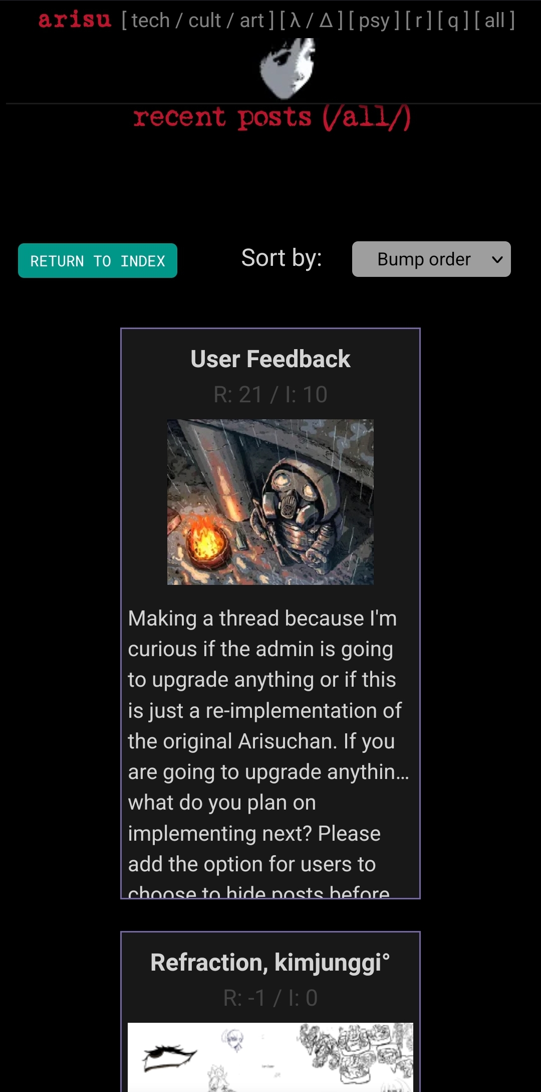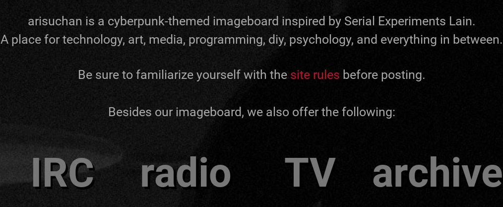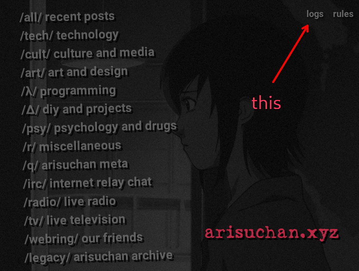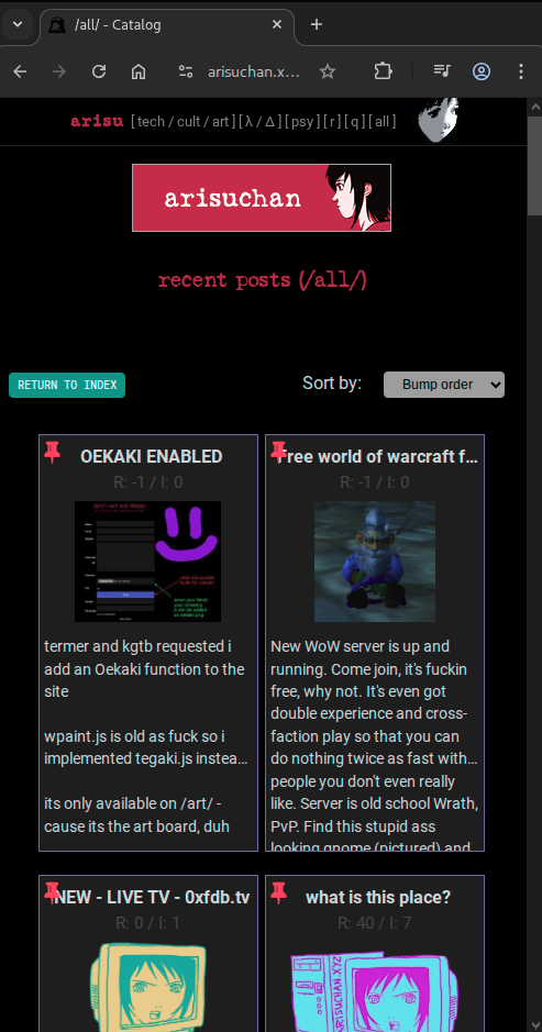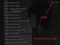 >(unless theres something else im forgetting about then ours is probably the best way to browse the arisuchan archive at this point)some of the missing stuff i couldnt find i just used placeholders or my closest guess for (i also made 1 small CSS change to fix image expanding on the archive for mobile browsers)